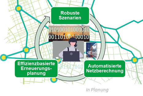 Durch den Einsatz digitaler Technologien erreichen wir einen hohen Automatisierungsgrad, indem wir die langfristige Netzplanung für das bestehende Netz eng mit der Netzentwicklung für den erforderlichen Netzausbau verknüpfen. Aufbauend auf den vorhan-denen Systemen ermöglicht dies für Planungsaufgaben eine durchgehende und effizi-ente Wertschöpfungskette, die vielseitig verwendbare, akzeptierte und belastbare Ergebnisse liefert (siehe auch die Anlage).